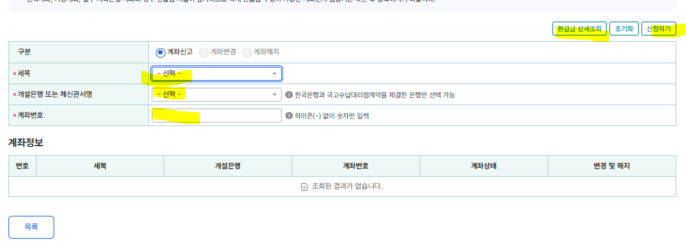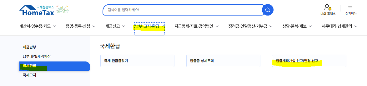 | 홈택스 → [My 홈택스] → [납부, 고지, 환급] → [환급계좌 신고,변경 신고] → [노란 표시 모두 진행] |