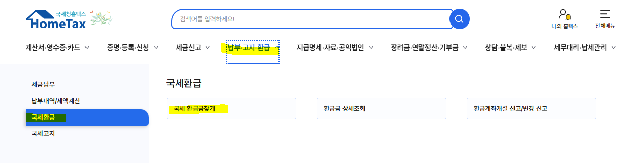 | 홈택스 접속 → [납부,고지,환급] → [국세환급] → [국세 환급금 찾기] → [주민등로번호,사업자등록번호] → [성명,상호] |
