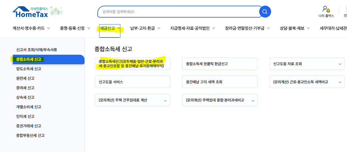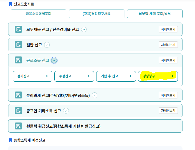 | 홈택스 접속 → [세금신고] → [종합소득세신고] → [필요한 신고 항목 옆 동그란 화살표 클릭] → [경정청구] 메뉴 이용 |